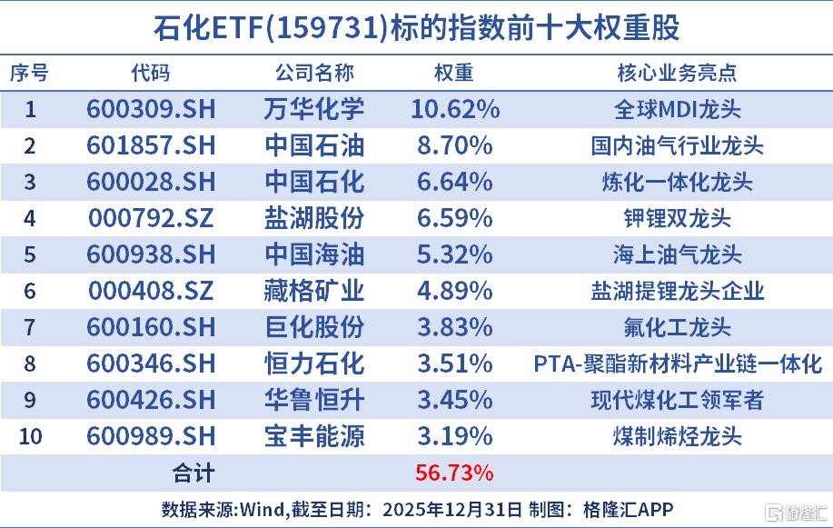 石化ETF(159731)跟踪石化产业指数,基础化工+石油石化双轮驱动,占比超91%,细分领域覆盖炼油化工 (25.4%)、聚氨酯 (10.6%)、钾肥 (8.6%)、磷肥及磷化工(7.1%) 等关键细分领域,直接受益于反内卷显效下,石化行业出清带来的涨价预期,一键打包三桶油、万华化学等产业龙头。