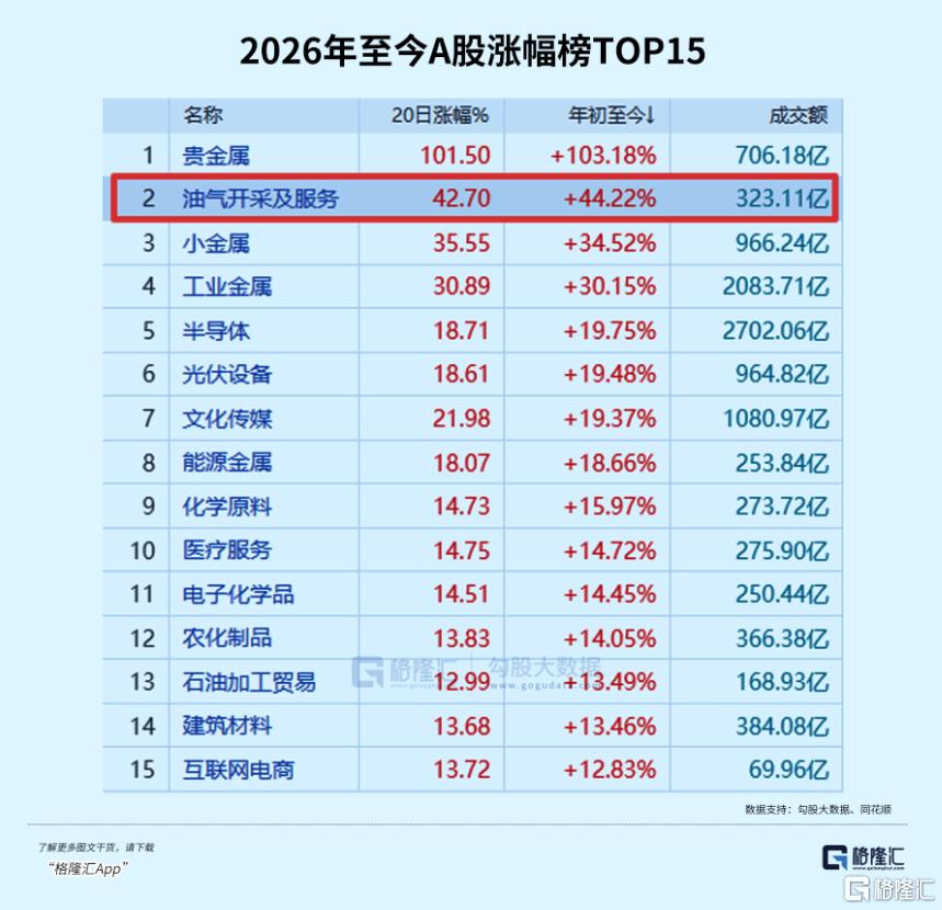 更亮眼的是A股油气板块,截至1月29日,油气开采及服务板块今年来已经累计大涨44.22%,涨幅位居全市场涨幅第二大,仅排在贵金属板块之下。板块中通源石油、科力股份在近20交易日涨幅已分别高达131.87%、99.7%,还有多只相关股票涨幅超过了50%。