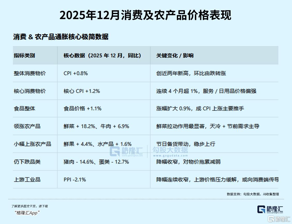 国家统计局数据,截至2025年12月,CPI(居民消费价格指数)与食品/农产品价格都出现了同步回升迹象。其中,CPI同比+0.8%(11月+0.7%),涨幅创2023年3月以来新高,核心CPI(剔除食品和能源)同比+1.2%,连续4个月保持在1%以上,显示服务与核心消费品价格韧性较强,是消费通胀的重要支撑。