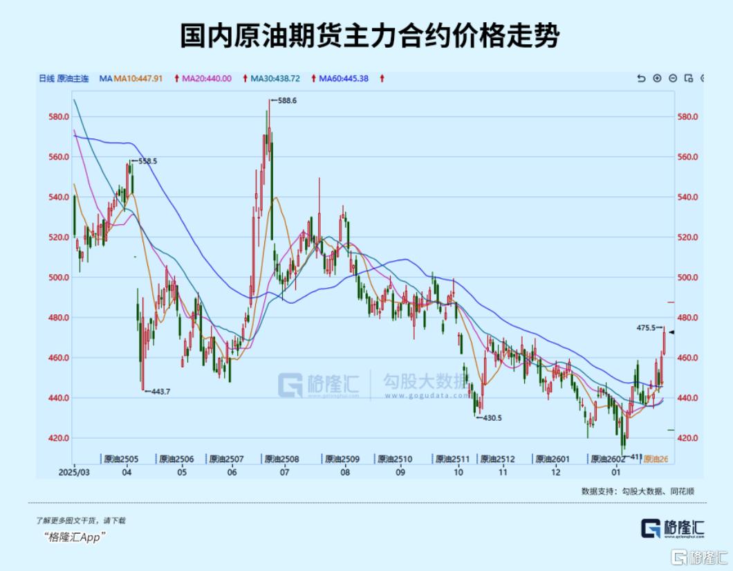 实际上,能源石化板块的上涨并非最近两天才开启,而是从2026年1月初就开始迎来底部反弹走势,国内原油期货也从月初的411元/桶连续反弹到475元/桶,幅度已达到了15%。