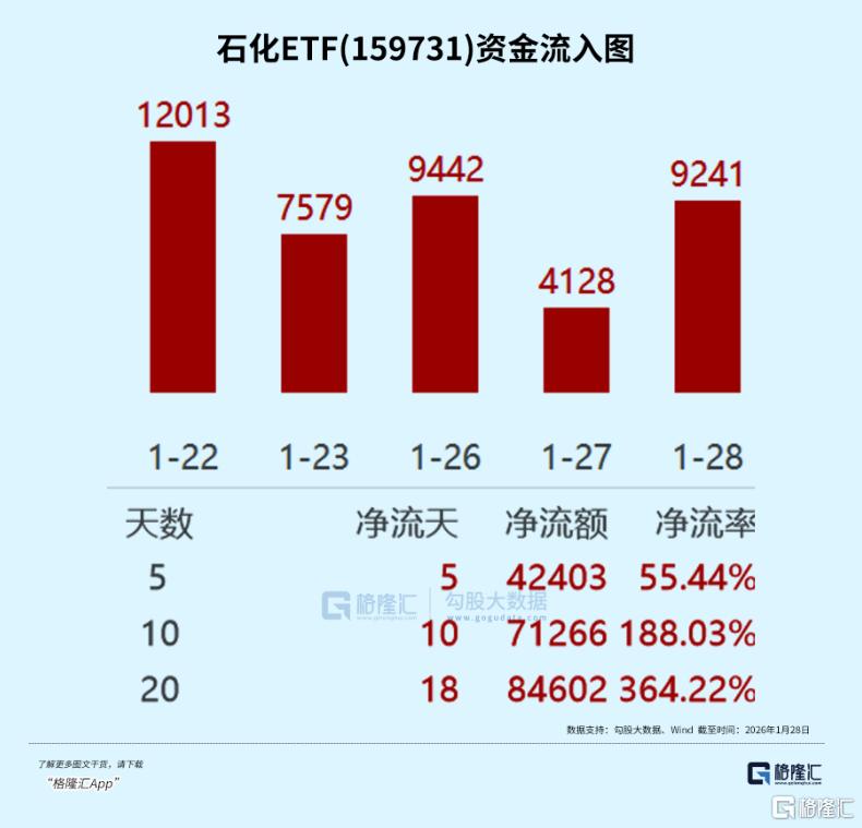 从1月7日起,石化ETF(159731)已经连续16个交易日获资金净申购,合计净流入8.38亿元,居同标的产品第一。