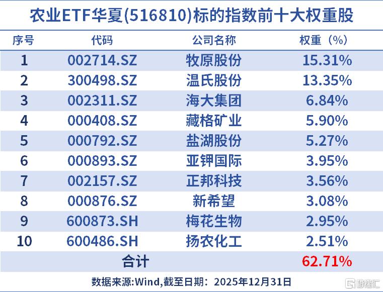 农业ETF华夏(516810),跟踪中证农业主题指数,农林牧渔+基础化工占比高达93.7%,覆盖从上游农资(化肥、农药、种子)到中游养殖(生猪、禽类)再到下游加工,形成完整产业闭环,有效分散单一环节风险。权重股包括牧原股份(生猪养殖龙头)、温氏股份(肉鸡、生猪养殖)、海大集团(饲料+养殖)和藏格矿业(钾肥+锂资源)。
