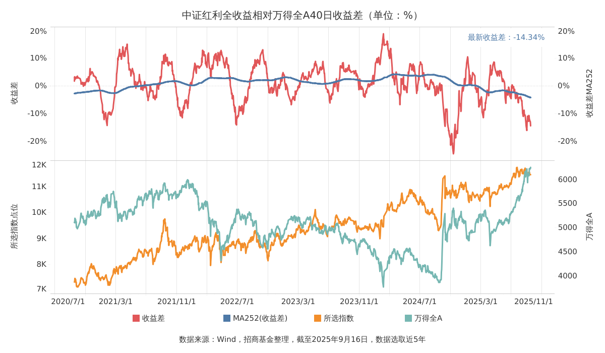 另一方面,中证红利短期择时指标或指向布局价值渐近。招商基金数据显示,截至9月16日, 中证红利 全收益指数相对万得全A指数40日收益差值为-14.34%,依然处于年内低位水平。