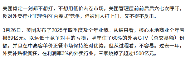 更为关键的是,美团守住外卖市场的代价,相比友商一年上千亿、一年五百亿的补贴,美团代价更少,财报数据显示:2025年全年,美团净亏损234亿元,核心本地商业亏损仅为69亿元。