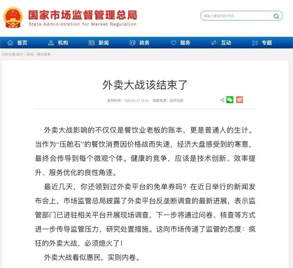 近日,国家市场监督管理总局官网转载《经济日报》评论文章《外卖大战该结束了》,该文章称:外卖大战影响到每一个人的生计,因此平台应该进行技术创新、效率提高、服务优化的健康竞争。
