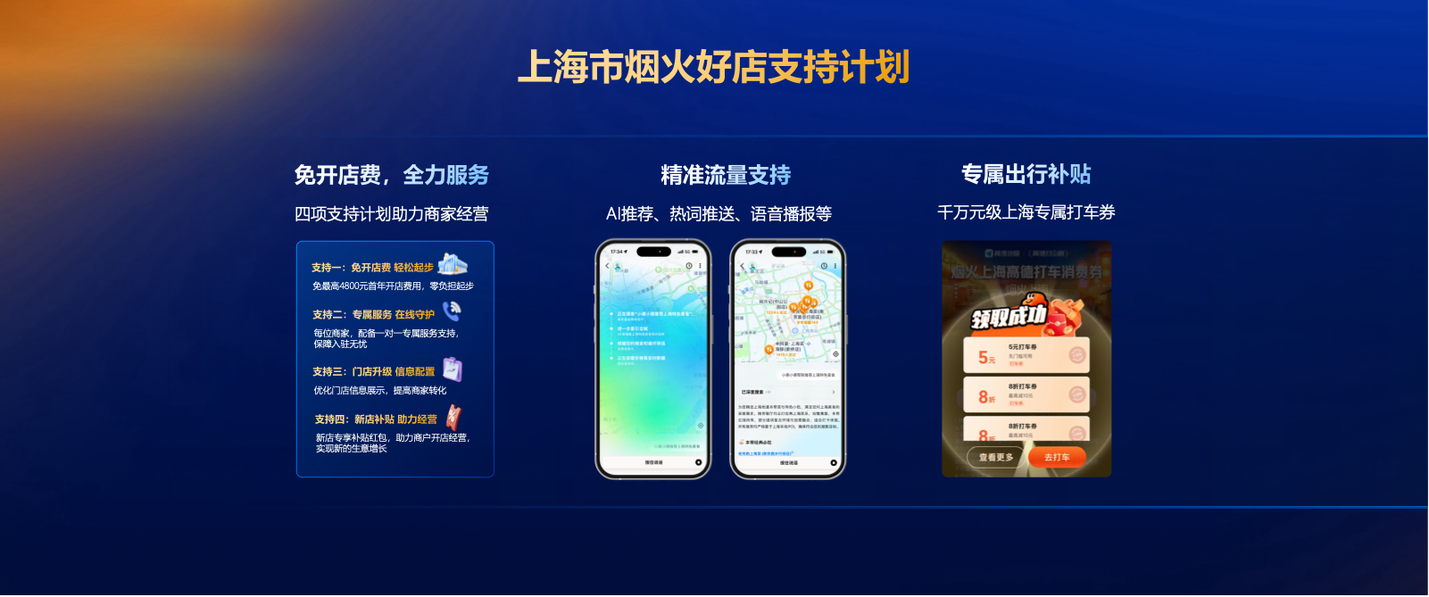 在“烟火上海”发布会上,高德同步推出了上海市“烟火好店支持计划”, 面向上海商家提供从新店入驻到经营增长的全周期助力。本地新店入驻可享四大权益:免最高4800元首年开店费、一对一专属服务、门店信息优化及新店补贴红包。