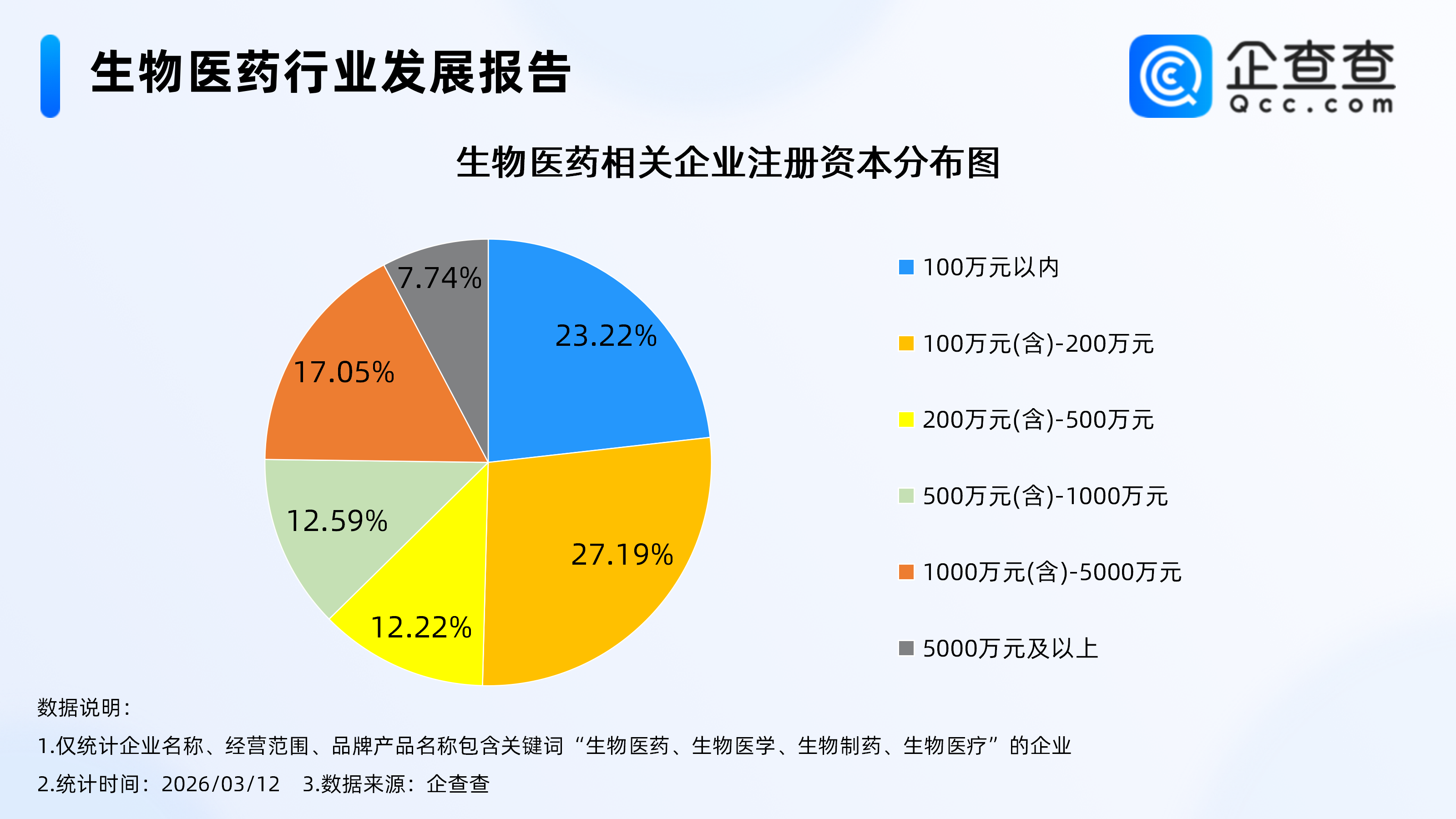 企查查数据显示,从注册资本分布来看,生物医药企业呈现金字塔型资本结构,市场准入门槛适中,创新试错空间充足。注册资本200万元以下的企业占比最高,达50.41%,说明中小微企业是行业主力军,这类主体更具创新灵活性,有利于技术迭代与模式创新。注册资本在200-1000万元的企业合计占比24.81%,构成产业成长型梯队,逐步向规模化发展。注册资本在1000万元及以上的企业占比24.79%,代表行业内具备重资产投入与研发能力的龙头企业,是突破核心技术、参与国际竞争的核心载体。 这种资本结构既保障了行业创新活力,又形成了“中小微创新+龙头引领”的良性生态,为政策落地后的研发投入增长提供了多元载体。