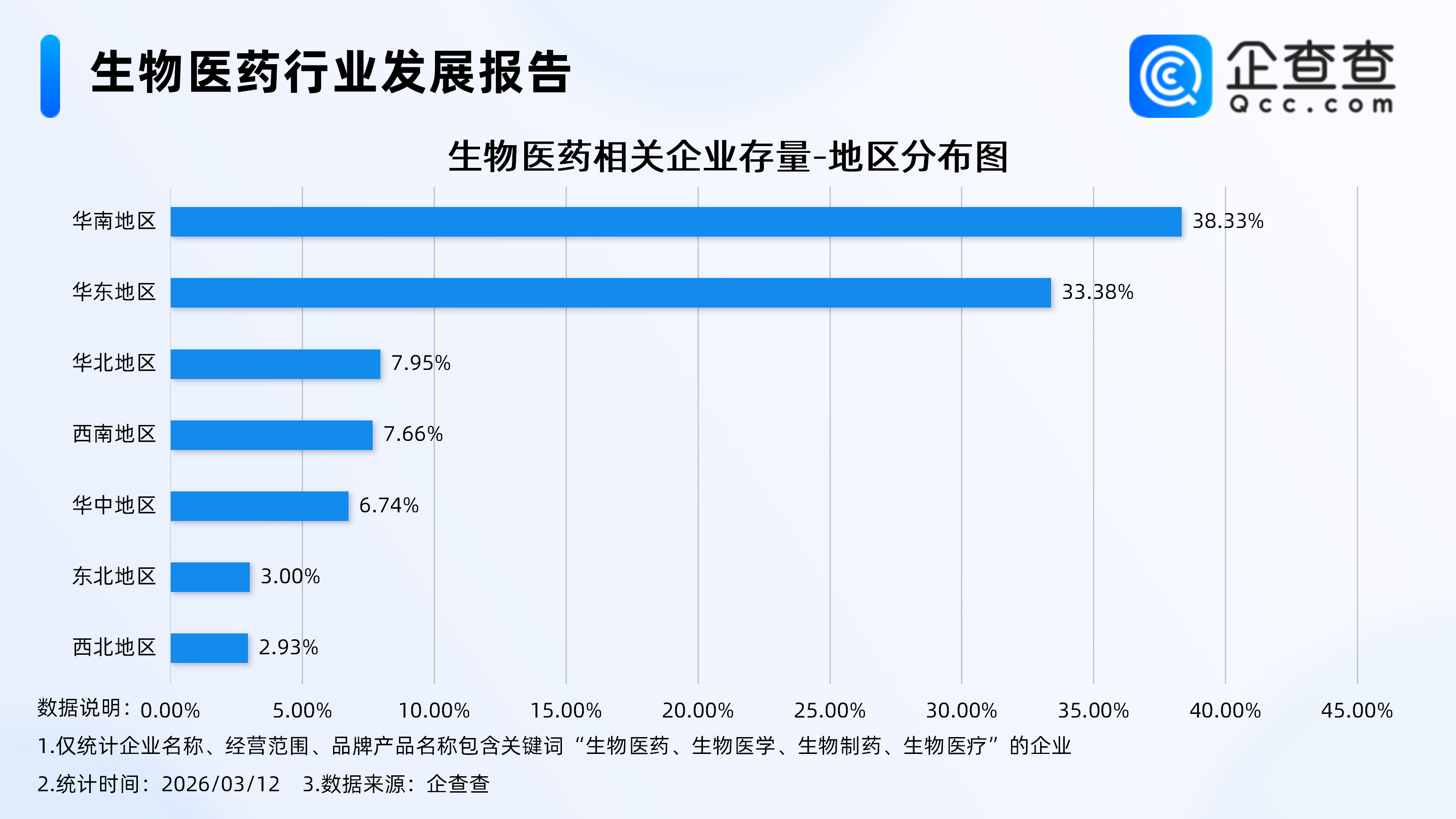 企查查数据显示,截至3月12日,国内现存生物医药相关企业4.57万家。从成立年限来看,83.41%的企业成立于10年内,从注册资本来看,在200万元以下的企业占比最高,达50.41%,说明中小微企业是行业主力军。从地区存量分布来看,生物医药产业呈现高度集聚、区域协同的发展格局,其中华南地区占比38.33%,华东地区占比33.38%,两大区域合计占比71.71%。