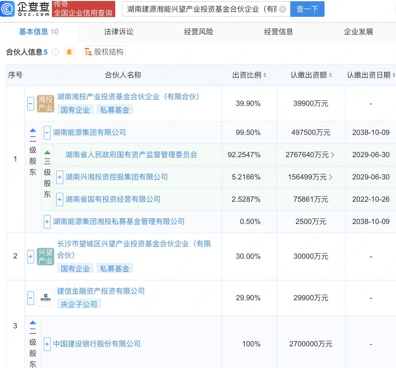 企查查APP显示,近日,湖南建源湘能兴望产业投资基金合伙企业(有限合伙)成立,出资额10亿元,经营范围包含:以私募基金从事股权投资、投资管理、资产管理等活动。企查查股权穿透显示,该企业由湖南湘投产业投资基金合伙企业(有限合伙)、建设银行(601939)全资子公司建信金融资产投资有限公司等共同出资。