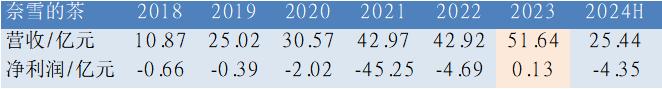 尽管营收持续增长,但2018年至今,奈雪仅2023年微盈1300万,其他时间都在亏损。到2024年上半年,奈雪累计亏损已经达到57亿。