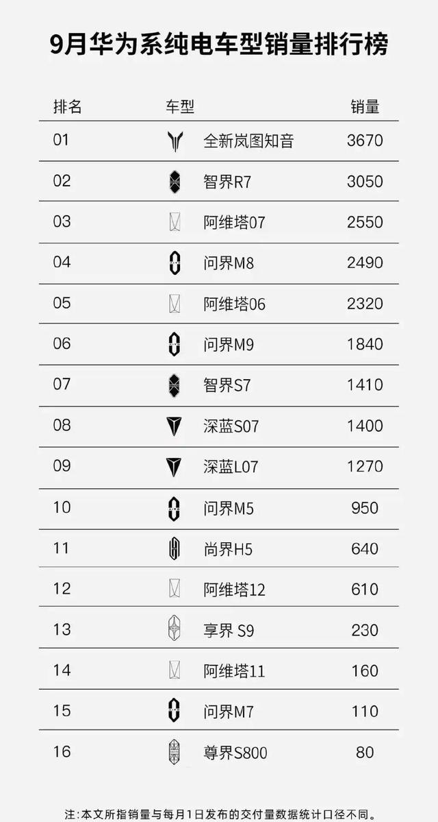 根据媒体统计的9月华为系纯电车型销量排行榜,全新岚图知音以3670辆的成绩跃居榜首,智界R7、阿维塔07紧随其后,销量均突破2500辆大关,而赛力斯今年新发布的车型问界M8则位列第四名。