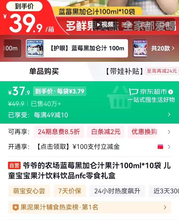以柚子汁为例,在京东上,爷爷的农场金银花柚子汁100ML*10袋装时,其产品介绍显示,是儿童饮料饮品NFC果汁宝宝零食送礼盒,并在卖点上特别标注为100%原果汁。