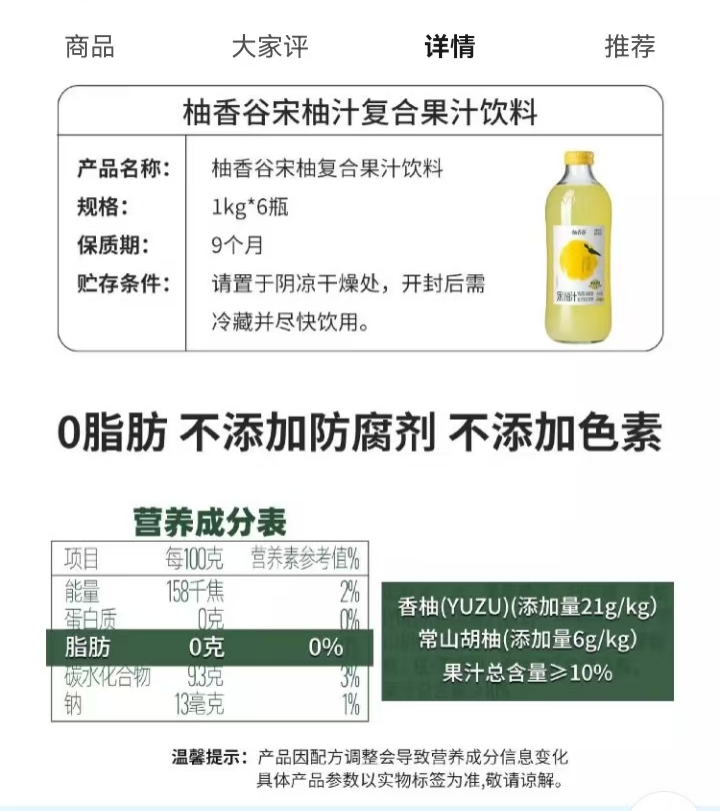 一是果汁添加量,柚香谷官方表示,香柚和胡柚的添加量分别为21g/kg、6g/kg,据此计算,一瓶一公斤的宋柚汁中,香柚+胡柚的真果添加量只有27g。