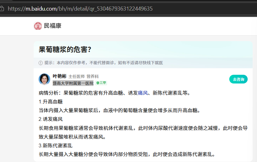 可以看到,果葡糖浆的添加量仅次于水,对于大多数追求健康的人来说,果葡糖浆过量摄入对身体并不好,据暨南大学附属第一医院营养科主任医师叶艳彬表示,果葡糖浆的危害有升高血糖、诱发痛风、新陈代谢紊乱等。