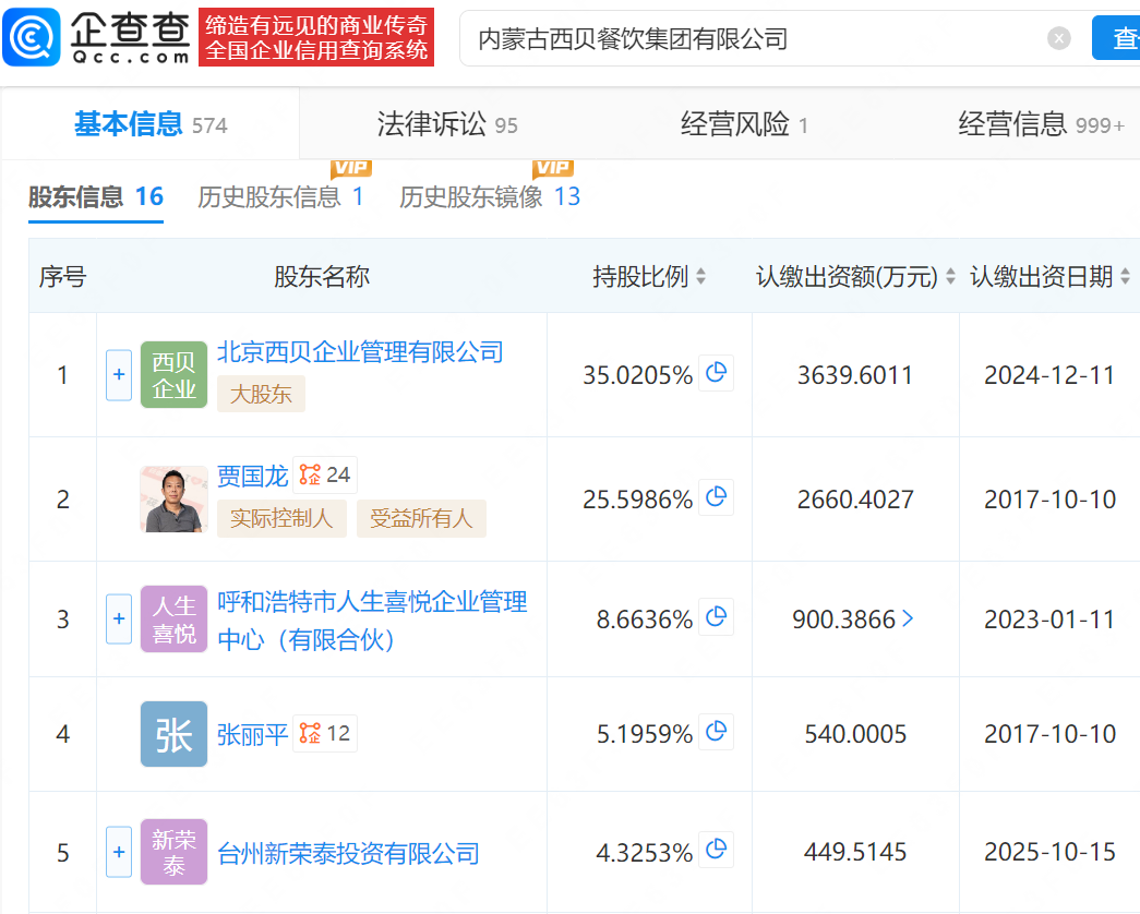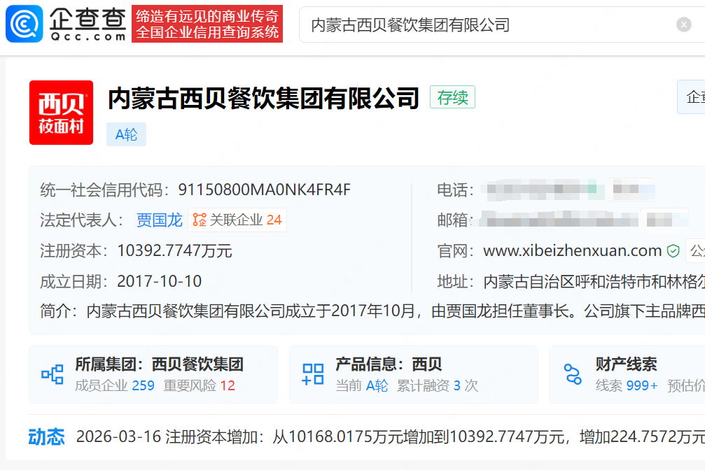 企查查APP显示,内蒙古西贝餐饮集团有限公司已申请多枚“天边”、“天边的厨房”商标,国际分类涉及餐饮住宿、材料加工、教育娱乐等,目前多数已注册成功。内蒙古西贝餐饮集团有限公司成立于2017年10月,注册资本约1.04亿元,法定代表人、董事长、总经理为贾国龙,经营范围包含餐饮服务、食品生产、食品互联网销售等,由北京西贝企业管理有限公司、贾国龙等共同持股。