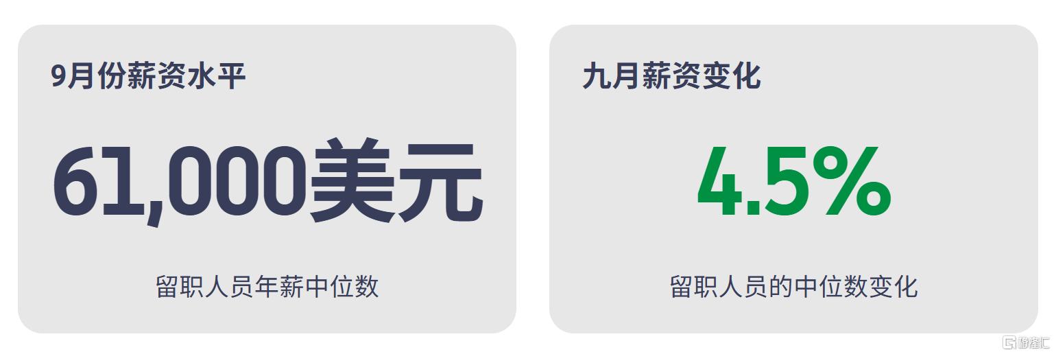薪资方面,9月份,留职人员的薪资同比增长率几乎没有变化,为4.5%。换工作人员的薪资增幅从8月份的7.1%放缓至6.6%,其中休闲、酒店和金融活动领域的薪资增幅最大。