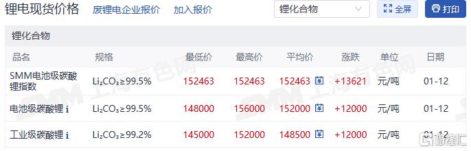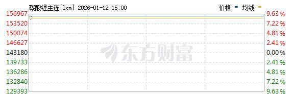 1月12日,碳酸锂期货主力合约封住涨停,涨幅9%,报156,060元/吨,为两年来首次突破15万元关口。