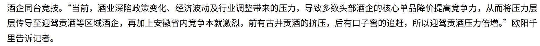 在此背景下,迎驾贡酒既要应对茅台、五粮液、山西汾酒、洋河股份、泸州老窖等一线名酒下沉所带来的打击,还要与古井贡酒、口子窖、金种子酒等同省上市酒企同台竞技。据《华夏时报网》报道,酒水行业研究者欧阳千里分析认为,“当前,酒业深陷政策变化、经济波动及行业调整带来的压力,导致多数头部酒企的核心单品降价提高竞争力,从而将压力层层传导至迎驾贡酒等区域酒企。”