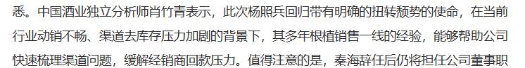 据《经济观察报》报道,中国酒业独立分析师肖竹青表示,此次杨照兵回归带有明确的扭转颓势的使命,在当前行业动销不畅、渠道去库存压力加剧的背景下,其多年根植销售一线的经验,能够帮助迎驾贡酒快速梳理渠道问题,缓解经销商回款压力。