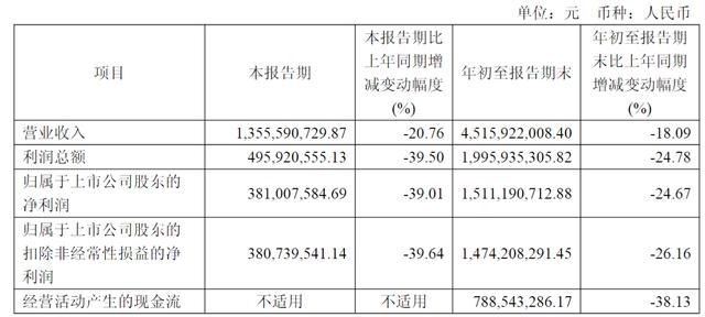 2025年前三季度,迎驾贡酒实现营业收入45.16亿元,同比下降18.09%;归母净利润15.11亿元,同比下降24.67%;其中第三季度单季归母净利润降幅更是达到39%。