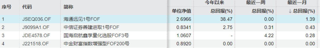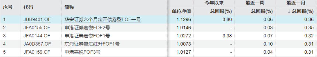 其中,“申港证券嘉悦FOF2号”单月收益0.35%,排名第二;“申港证券嘉悦FOF1号”月收益0.32%,位居第三;“申港嘉悦FOF3号”月收益0.31%位居第五,与排名第一的“华安证券六个月定开债券型FOF一号”0.36%的月收益率,以及排名第四的“东海证券星汇红升FOF1号”0.31%的月收益率差距较小。