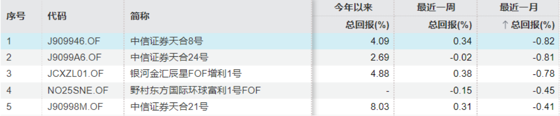 不过,虽然资金面宽松推动了债市走强的趋势,但该行情下仍有46支债券型FOF收益“告负”。其中,中信证券有3支产品排在后五位。具体来看,处于收益率末位的5支债券型FOF分别是“中信证券天合21号”、“野村东方国际环球富利1号FOF”、“银河金汇辰星FOF增利1号”、“中信证券天合24号”以及“中信证券天合8号”,当月收益率分别为-0.41%、-0.45%、-0.78%、-0.81%、-0.82%。