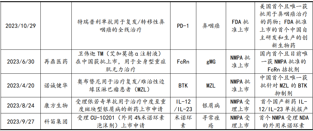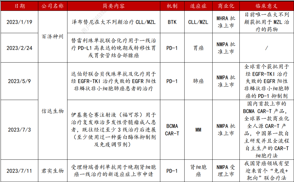 港股方面,方正证券梳理后认为,随着国产创新药认可度持续上升,商业化成果将逐渐兑现。越来越多国产自研的创新药产品取得较好的临床试验及商业化成果,港股中包括百济神州的替雷利珠单抗、信达生物的伊基奥仑赛注射液、君实生物的特瑞普利单抗等明星产品均在2023年有适应症通过NMPA审批上市,且大都具有里程碑式的意义,市场格局较好。