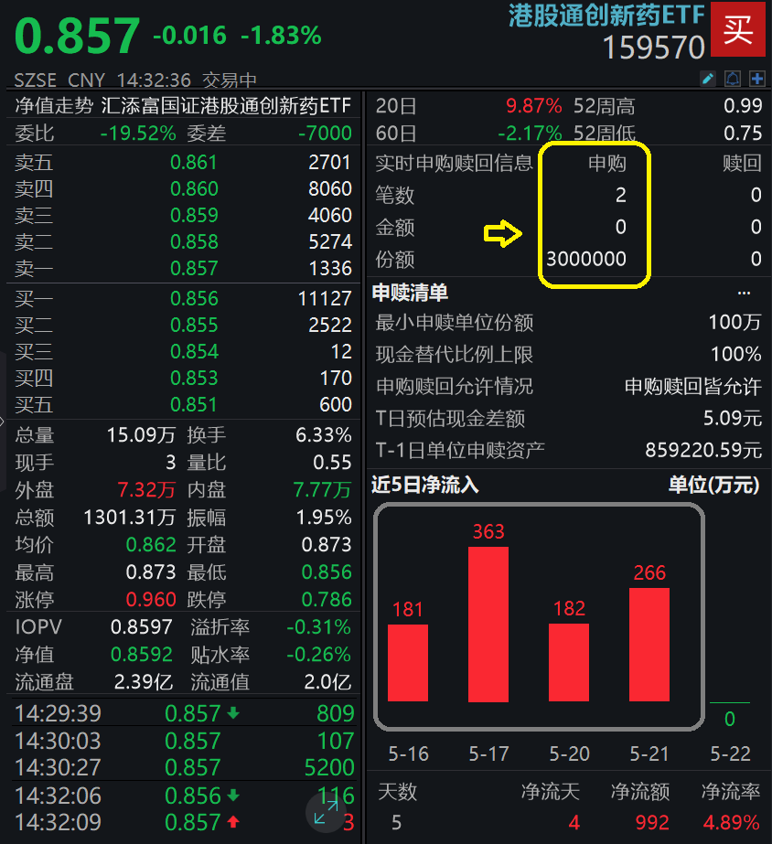 资金面上,港股通创新药ETF(159570)近5日内有4日吸金合计近1000万元,近5日合计获得资金净申购992万元,今日盘中资金再度逢跌净申购300万份,资金越跌越买势头明显!港股通创新药ETF(159570)最新规模达2.05亿元,高居同类产品第一。