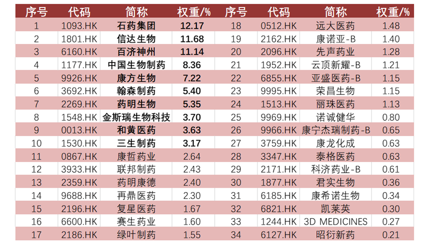 港股通创新药ETF(159570)跟踪的国证港股通创新药指数(987018)全部持仓股和对应权重如下: