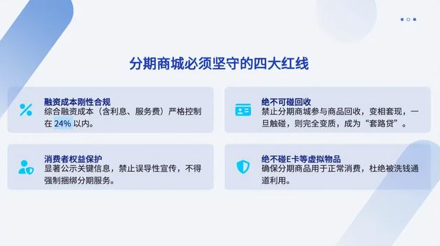 禁止分期商城参与商品回收,变相套现,一旦触碰,则完全变质,成为“套路贷”。