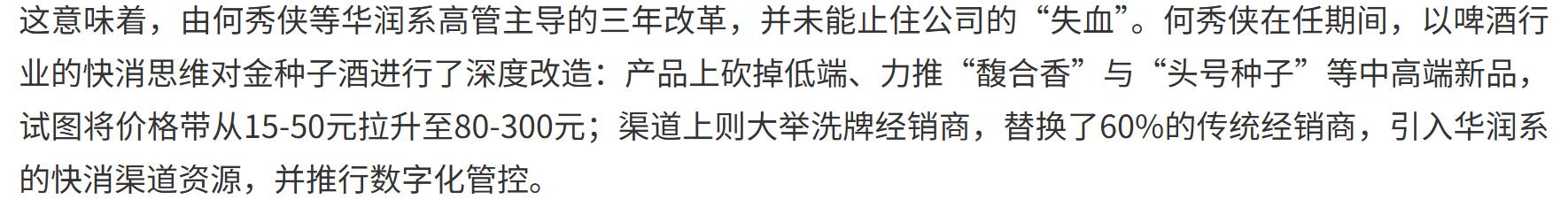 据《南方都市报》报道,何秀侠在任期间推行了激进改革:产品端,大力砍掉低端、力推“馥合香”与“头号种子”等中高端新品,试图将价格带从15-50元拉升至80-300元;渠道端,大规模洗牌经销商,替换了约60%的传统经销商,并引入华润庞大的啤酒渠道网络,推行数字化管控。
