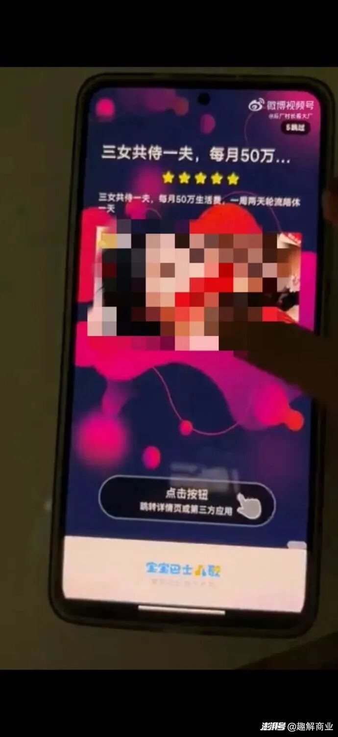 有家长在社交媒体发文,宝宝巴士儿歌APP打开时,开屏跳转低俗擦边直播等第三方广告。网友截图显示,有广告页面直接打出“三女共侍一夫,每月50万生活费”的标题,并可看到着装暴露的女士。