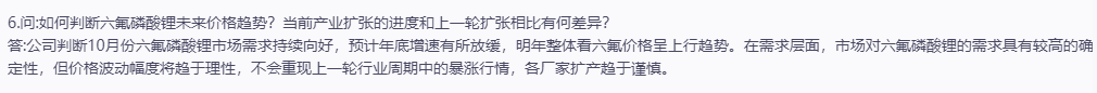 公司原话:“公司判断10月份六氟磷酸锂市场需求持续向好,预计年底增速有所放缓,明年整体看六氟价格呈上行趋势。在需求层面,市场对六氟磷酸锂的需求具有较高的确定性,但价格波动幅度将趋于理性,不会重现上一轮行业周期中的暴涨行情,各厂家扩产趋于谨慎。”