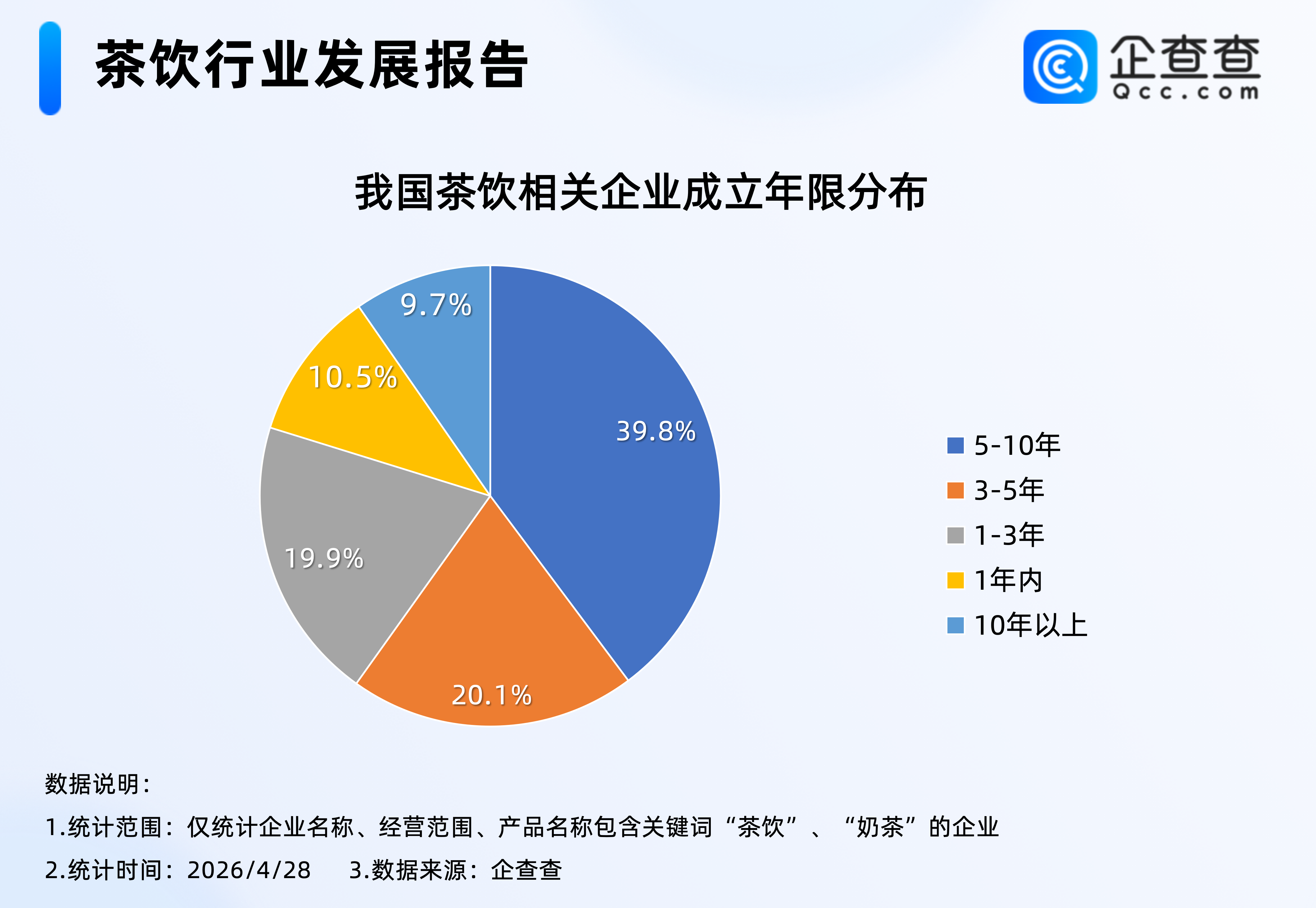 企查查数据显示,截至2026年4月28日,我国现存32.9万家茶饮相关企业,成立年限上,我国茶饮领域以老牌企业为主,成立5至10年的企业最多,占比近四成,达39.8%,成立10年以上的企业占比9.7%,综合来看,我国近五成茶饮相关企业成立超5年。