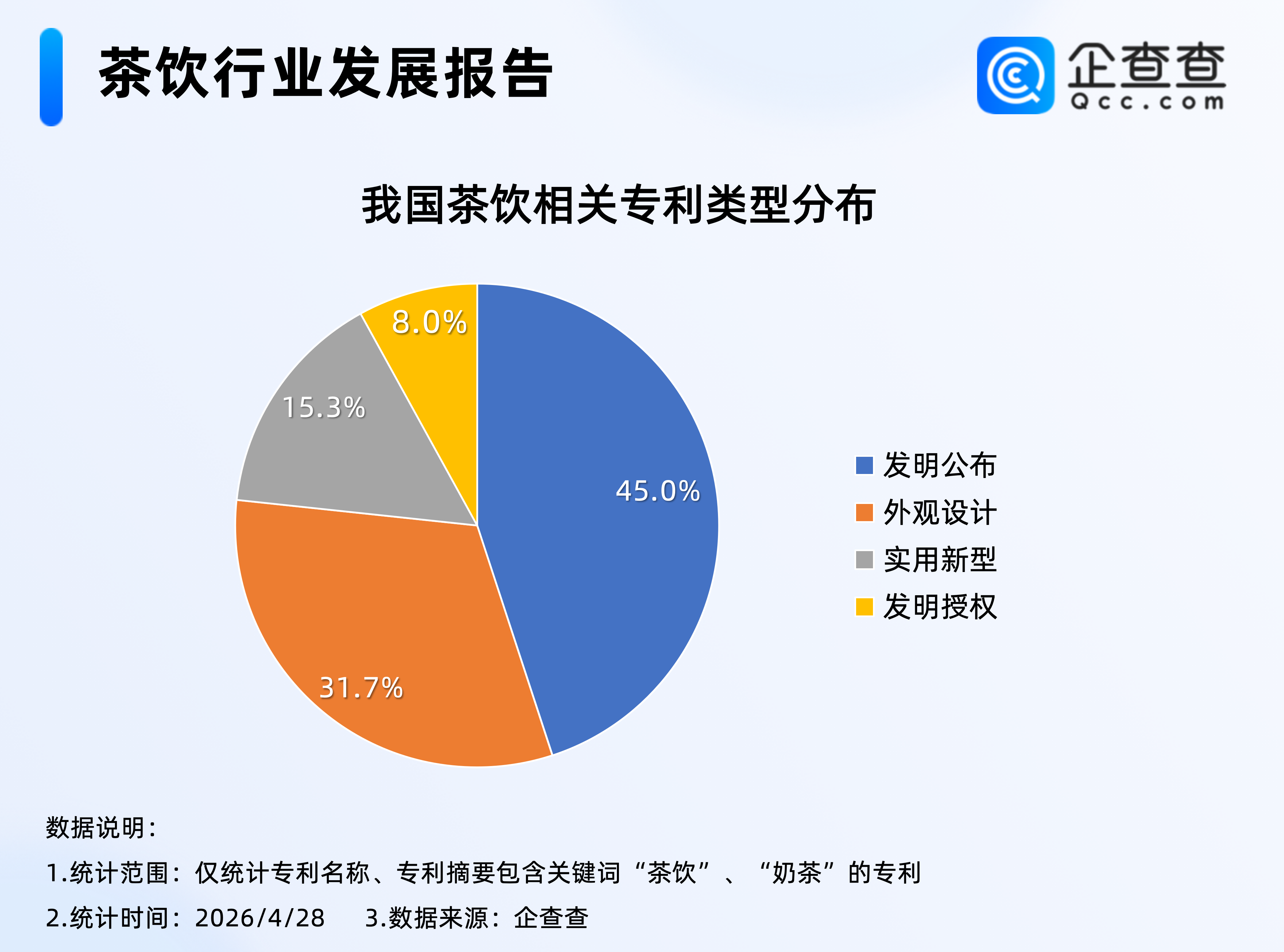 企查查数据显示,近五年,我国茶饮相关专利每年申请量在700至1300项之间。截至2026年4月28日,我国现有1.5万项茶饮相关专利,专利类型上以发明公布为主,占比45.0%,其次是外观设计,占比31.7%。