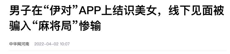 据中华网河南2022年报道,一位男用户通过伊对APP认识一位美女,在线下见面时被骗入“麻将局”输了6万多元,之后便再也联系不到该女子。