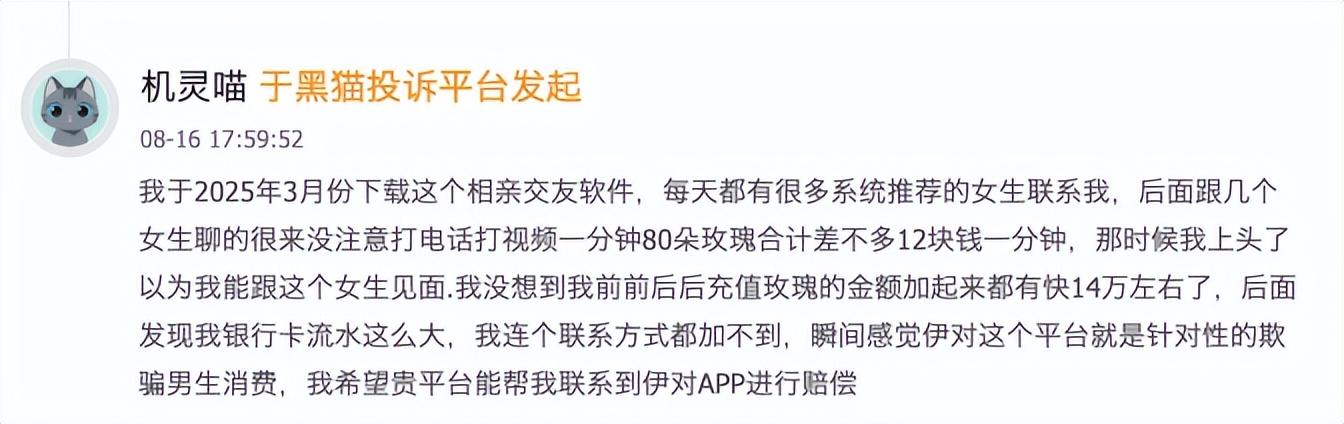 比如,有用户在黑猫投诉平台投诉,他下载伊对后,每天收到很多女生邀请,后面跟几个女生聊天很上头,为了能够跟她们视频聊天,前前后后充14万元买玫瑰,却连个联系方式都没加到。
