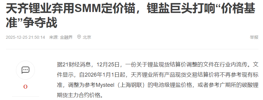 据21财经报道,天齐锂业声明由于某第三方报价机构对碳酸锂价格失真,所有产品现货交易结算价将不再参考现有标准,调整为参考Mysteel(上海钢联)的电池级锂盐价格,或者参考广期所的碳酸锂期货主力合约价格。