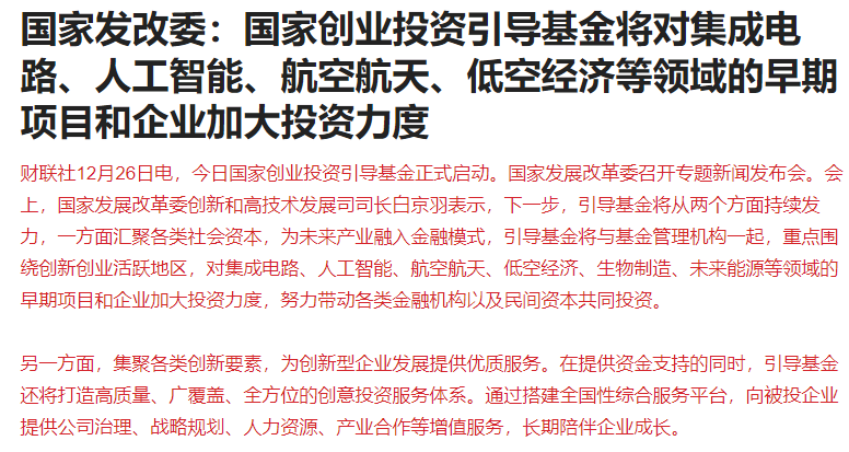 国家发改委:国家创业投资引导基金将对集成电路、人工智能、航空航天、低空经济等领域的早期项目和企业加大投资力度