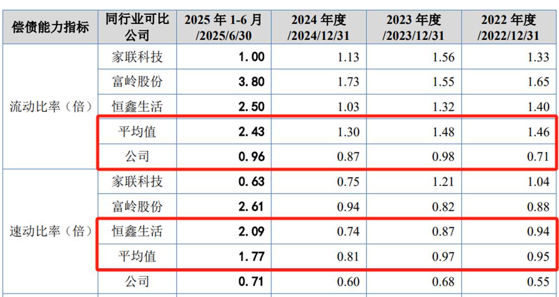 在偿债能力方面,新天力的资产负债率显著高于同行业平均水平。2022年至2025年6月末,新天力的资产负债率分别为62.09%、53.60%、50.56%和45.52%,虽然有所下降,但仍高于行业均值的44.01%、45.59%、46.09%和35.71%。高负债运营不仅会增加财务成本,也反映出公司自身积累有限,业务发展很大程度上依赖债务融资,现金流压力较大。此外,新天力的流动比率和速动比率远低于同行业可比公司,表明新天力的短期偿债能力较弱,资金流动性不足。