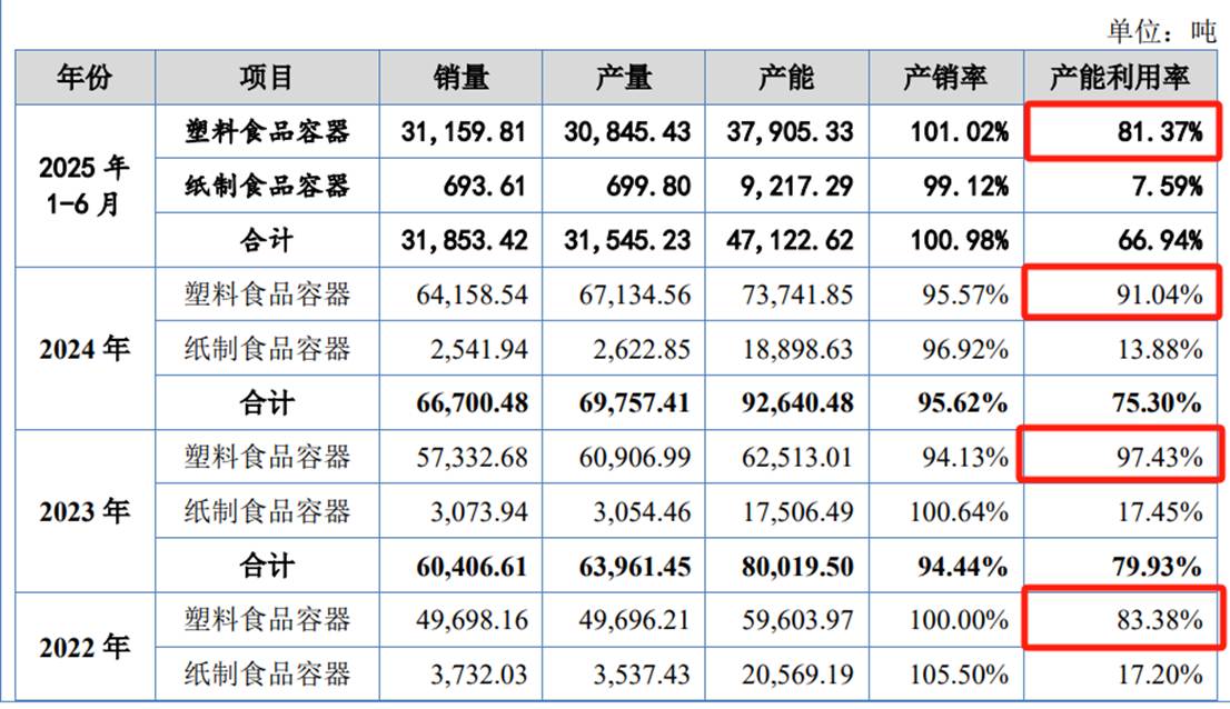 一方面,2022年至2025年1-6月,新天力塑料食品容器产能利用率分别为83.38%、97.43%、91.04%和81.37%,呈下降趋势。在现有产能尚未充分利用的情况下大幅扩产,可能引发产能过剩风险。新天力目前塑料食品容器产能为73741.85吨,募投项目规划新增产能36000吨。新增产能如何消化?