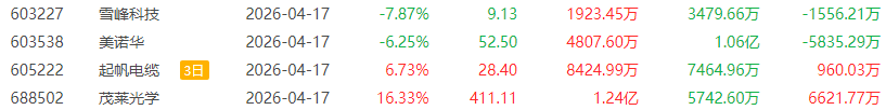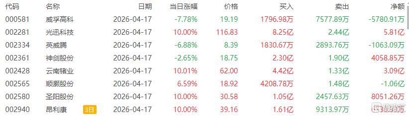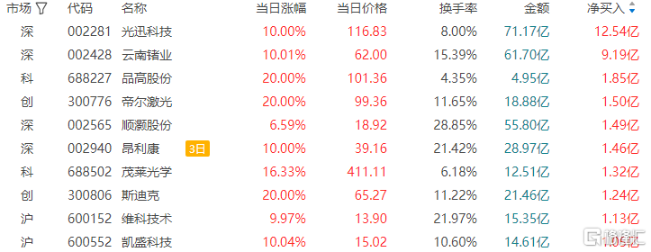 龙虎榜单日净买入额前三为光迅科技、云南锗业、品高股份,分别为12.54亿元、9.19亿元、1.85亿元。