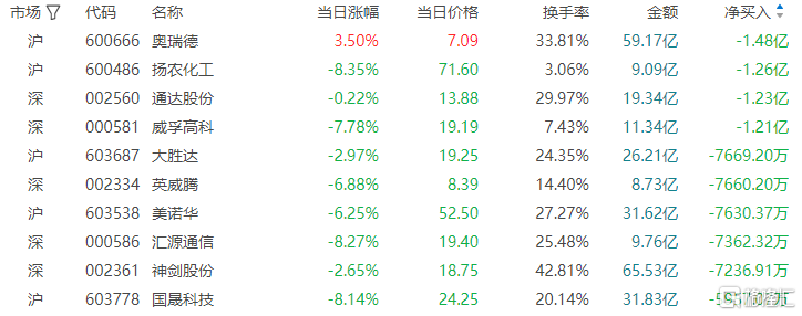 龙虎榜单日净卖出额前三为奥瑞德、扬农化工、通达股份,分别为1.48亿元、1.26亿元、1.23亿元。
