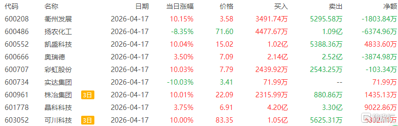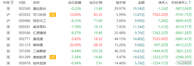龙虎榜中涉及机构专用席位的个股中,当日净卖出额前三为通达股份、扬农化工、威孚高科,分别为9872.04万元、8845.43万元、8314.71万元。