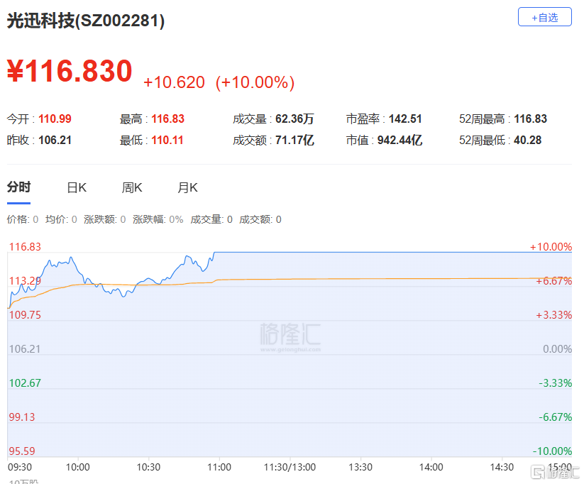 光迅科技:今日涨停创历史新高,偏离值9.63%,换手率8.00%,成交额71.17亿。龙虎榜数据显示,机构净买入6195.91万元,深股通专用席位净买入5.81亿元。