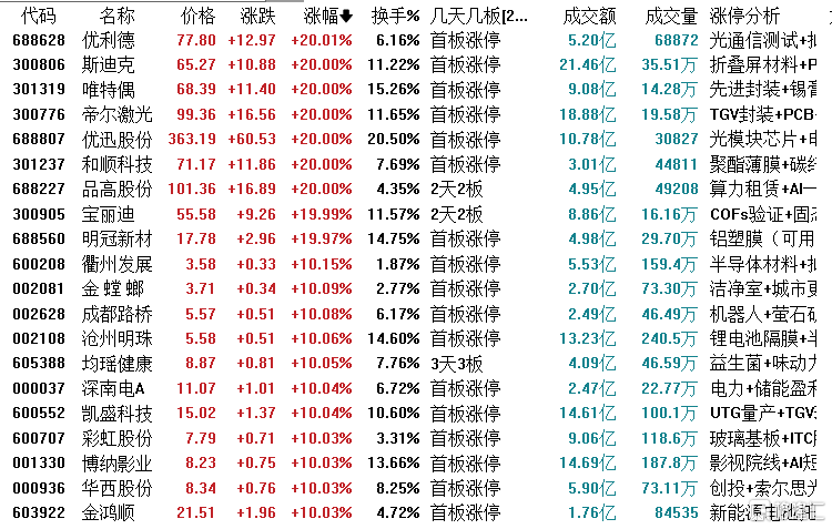 优迅股份:今日20cm涨停,偏离值20.00%,换手率20.50%,成交额10.78亿。龙虎榜数据显示,机构净买入9509.30万元。