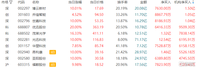 龙虎榜中涉及机构专用席位的个股中,当日净买入额前三为博云新材、乔锋智能、世嘉科技,分别为1.50亿元、1.05亿元、1.04亿元。