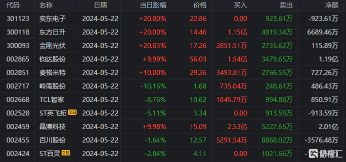 今日龙虎榜净买入额前三为TCL中环、晶澳科技、钧达股份,分别为4.68亿元、3.52亿元、1.85亿元。