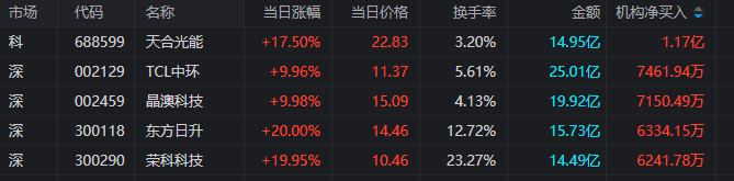 龙虎榜中涉及机构专用席位的个股中,当日净买入额前三为天合光能、TCL中环、晶澳科技,分别为1.17亿元、7461.94万元、7150.49万元。