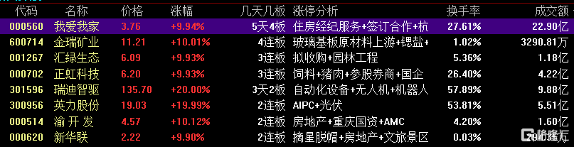 我爱我家:今日涨停,换手率27.6%,成交额22.9亿元。龙虎榜数据显示,机构合计净卖出3820.27万元,北向资金合计净买入409.74万元。赵老哥、宁波桑田路、北京中关村等知名游资榜上有名。